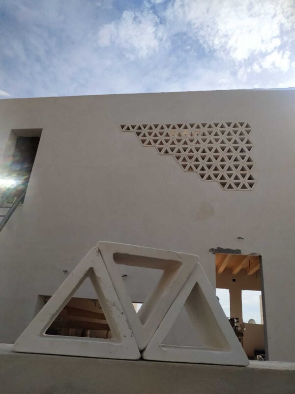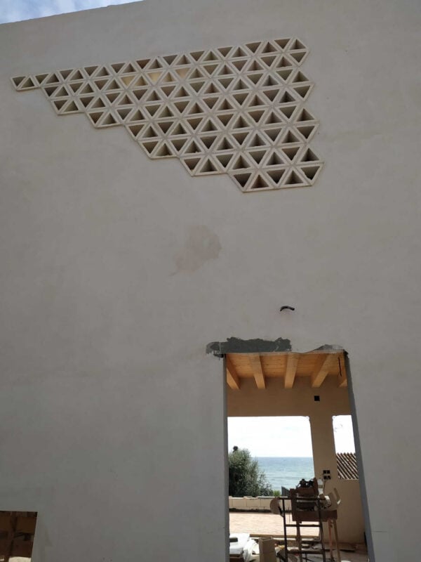 El funcionamiento es igual para otra partes de la casa. De camino a la terraza , junto a las escaleras, hay precisamente una celosía de bloques triangulares donde se instalará un jardín verticalque, al mismo tiempo que refresca el ambiente, sirve para la bajada del agua con las lluvias.