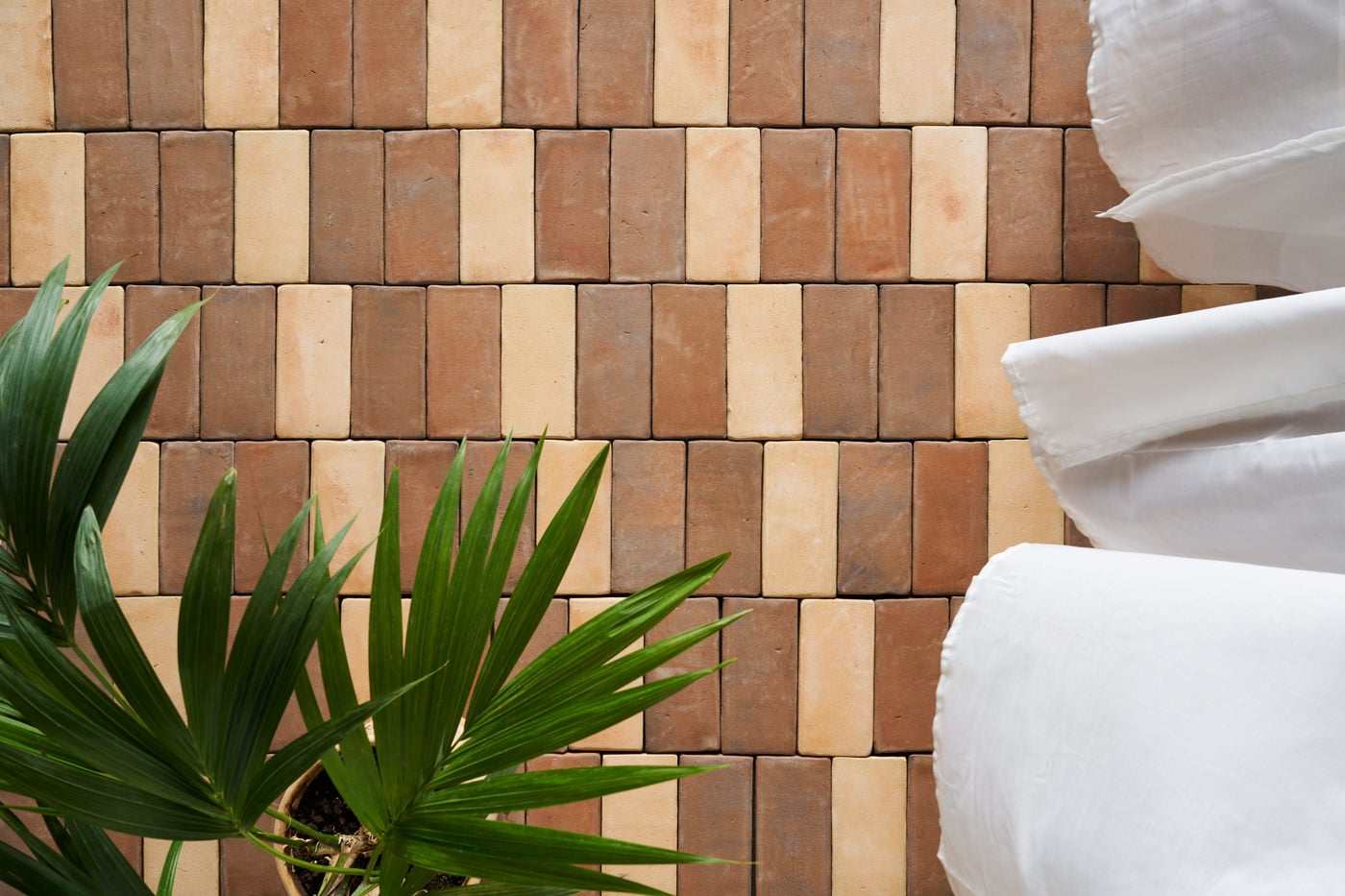 Un suelo y friso de ladrillos de barro cocido para Doble Uve, obrador artesano en Madrid