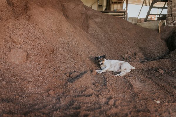 Un buen compañero descansando sobre el biocombustible: huesos de aceituna y restos de la poda de aguacate de la Axarquía