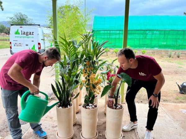 Desde el mismo día 5 de junio hasta el 11 de junio preparamos nuestros nuevos maceteros para llevarlos como decoración a la feria. En ellos irían plantadas especies adaptadas y autóctonas seleccionadas por nuestro equipo. Para el proceso de preparación no podían faltar los compañeros de Grupo Lagar, nuestros partners en especies y jardinería. Ellos tienen un vivero propio y nos cedieron las plantas que ocuparían estos maceteros.
