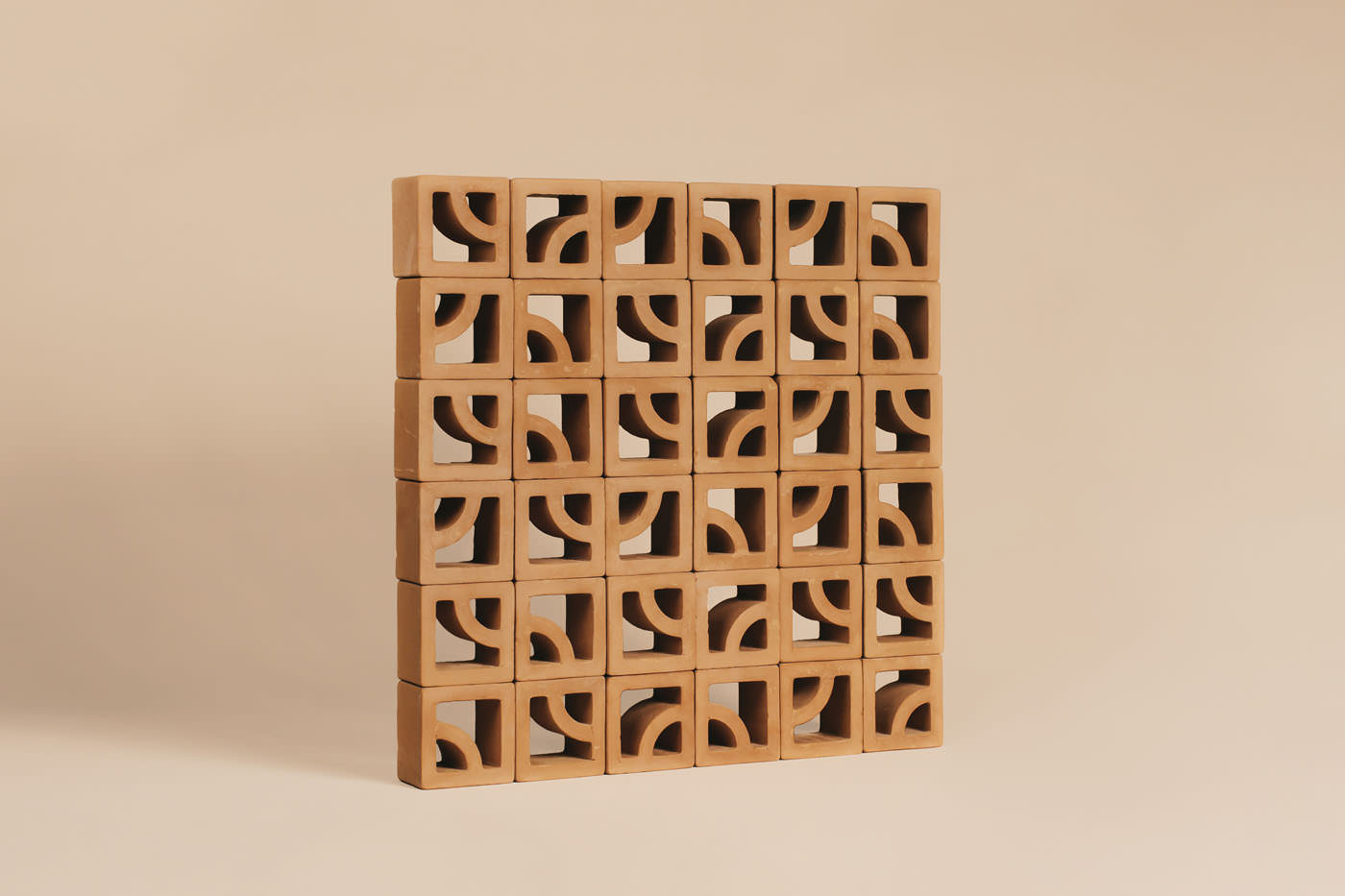 Al igual que la colección de baldosas Vélez, estas celosías diseñadas por Leblume también están inspiradas en la herencia artesanal del barro cocido tradicional de la Axarquía y en el arco de medio punto. Su diseño permite crear patrones orgánicos mediante la disposición y rotación de cada pieza, haciendo posible configurar tramas estructuradas o fluidas a partir de un único elemento.