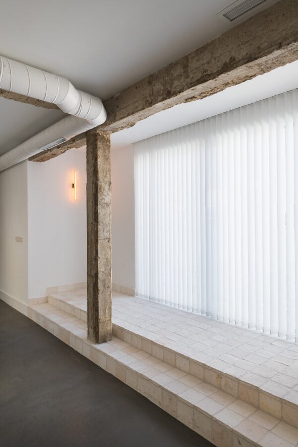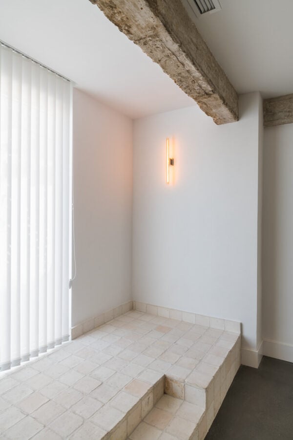 La tonalidad en Blanco Antiguo mantiene el equilibrio y la luminosidad del ambiente. El formato clásico cuadrado 15 y el propio material son un guiño al espíritu humilde del edificio. El resultado, funcional y cargado de significado, resulta del todo espectacular.