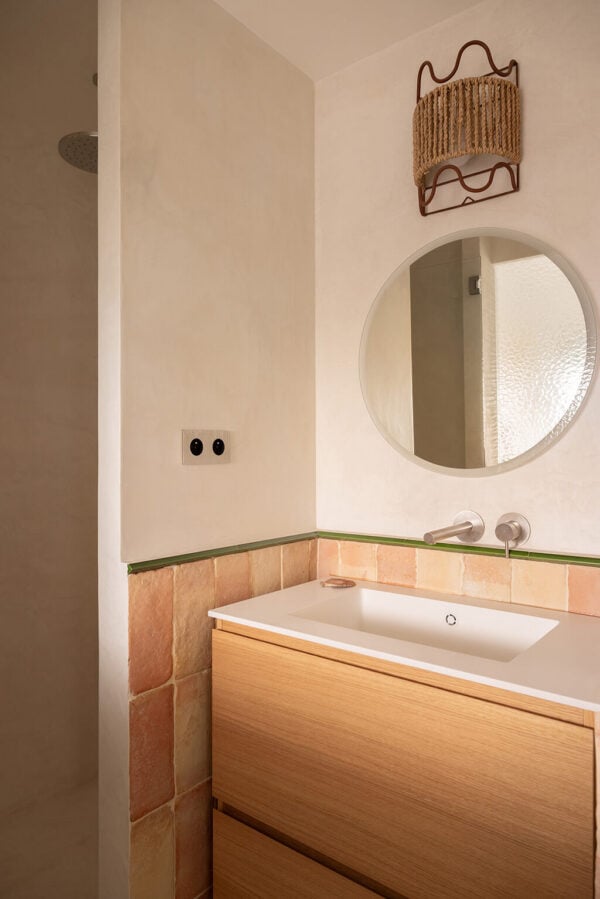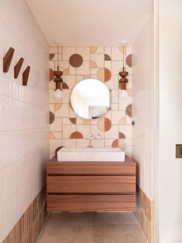 Como explican desde el estudio, en el proyecto se han priorizado la luz y el uso de materiales naturales. La combinación escogida (madera maciza, cristaleras de teselas tintadas, paredes de azulejos esmaltados…) apuntaba naturalmente hacia el estilo mediterráneo. La sinergias entre diseño y materiales han permitido en este proyecto dotar a cada pequeño espacio de una personalidad sencilla pero contundente.