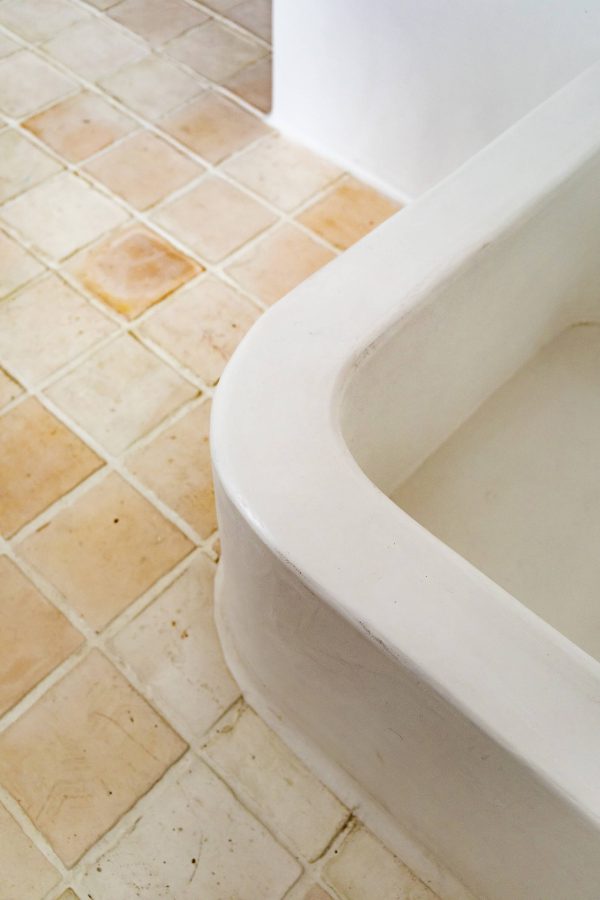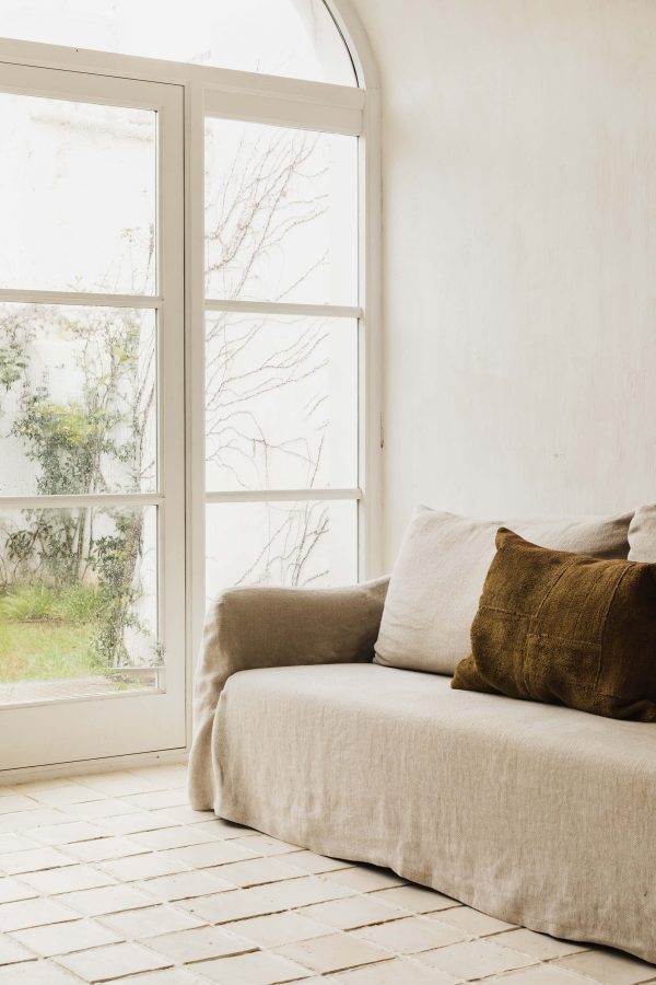 Todo en este proyecto es blanco, incluso lo que no lo es. El ventanal del patio, las paredes y el techo encalados y nuestro suelo de barro blanco capturan la luz. Uno no tiene la sensación de estar fuera recibiendo la luz, sino de que es la claridad la que se mete dentro de la casa.