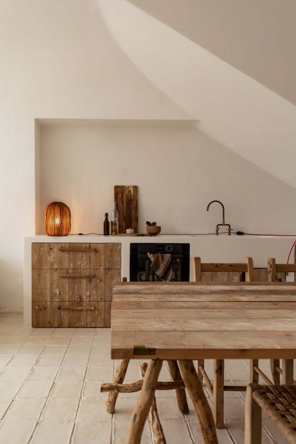 La casa es a la vez un espacio abierto y cerrado. Los acabados redondeados y la ausencia casi total de ángulos rectos (típica por otro lado de la arquitectura tradicional balear) dan una sensación de recogimiento tremenda. Con semejante ventanal, las zonas comunes, especialmente el salón, adyacente al patio, podrían haber quedado demasiado vulnerables al exterior. Sin embargo, los techos abovedados, las paredes encaladas, el suelo de barro artesanal y el mobiliario, cuidadosamente seleccionado, transforman el espacio en un acogedor nido. La casa se convierte en el interior de una cueva que de alguna forma es luminosa.