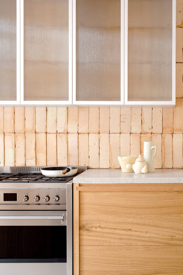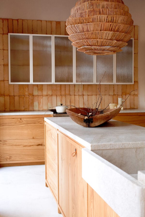 El Rectángulo 30×10 paja, utilizado como revestimiento principal, aporta un toque de elegancia y sofisticación a la cocina. Su diseño geométrico y su tonalidad cálida se integran perfectamente con los demás elementos del modelo Still, resaltando la belleza de la madera, la piedra y el barro presentes en el espacio.