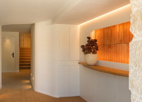 En la acertada reforma de sus apartamentos, apenas se encuentran ángulos rectos. Todas las esquinas, tanto de las paredes como de los muebles, están redondeadas, recordando quizá a las formas suaves de las botellas y al flujo del líquido granate que trae aquí a los visitantes. Este recordatorio no está solo en las formas: como hemos dicho también se encuentra en el color y en la elección de los materiales. Y aquí es donde sacamos a colación nuestros ladrillos rectangulares de barro rojo 40×10. El estudio los ha colocado en alternancia con un fondo de fibras que recuerdan al cañizo en unos cuadros rectangulares, perimetrados por una tira de luces led escondidas alrededor que iluminan el material con luz cálida.