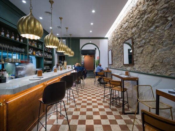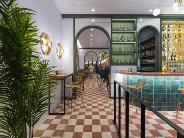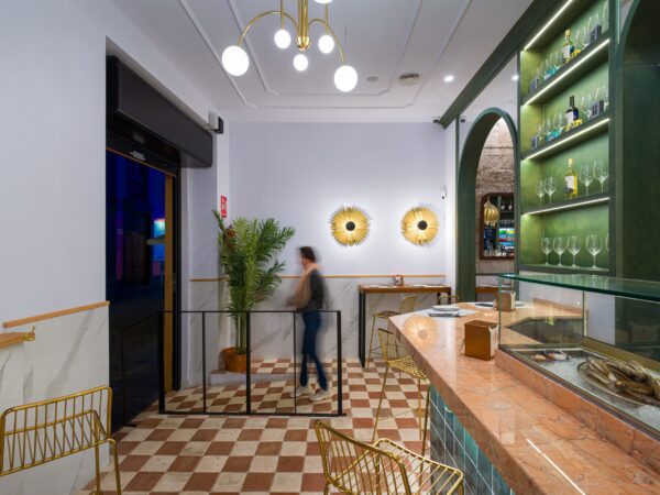 El lugar ha sido diseñado por Cúbica Estudio y consigue en cada zona del bar llevarnos a ese concepto de lo español, castizo pero muy lejos de resultar en exceso añejo. Primero con la zona de la vermutería, la más próxima a la calle y que nos recibe con una fabulosa imagen. Los típicos taburetes, una barra ya de bienvenida, las estanterías de vino, esperando desde ese momento ser descorchadas. Esa tendencia hacia lo castizo se nota a simple vista nada más pasar a la segunda zona: la barra central . Ya sea para comer de pie o en taburetes, pero siempre en relación con el otro y con el espacio. Porque el proyecto de Cúbica deja claras sus intenciones: caminar hacia lo que mejor y más se hace en un bar en España, charlar.
