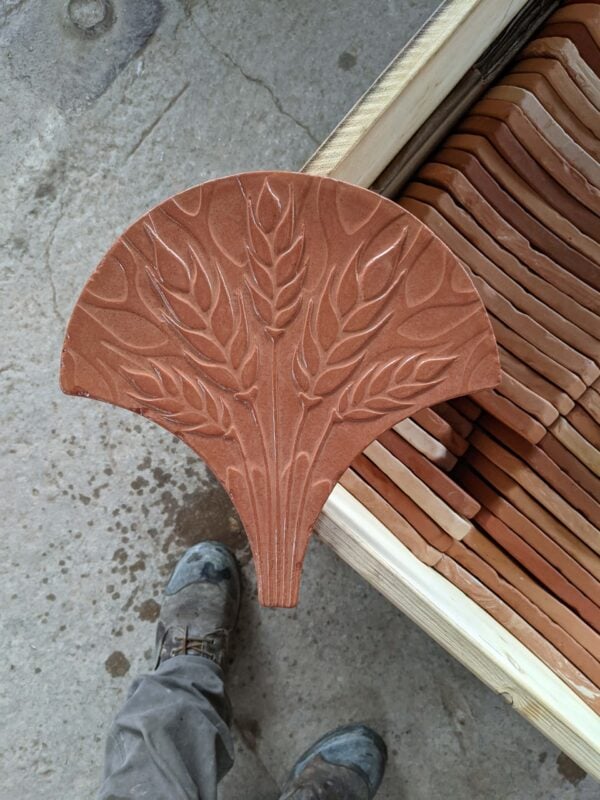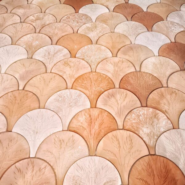 En este encargo, se ha reinventado una de nuestras piezas más emblemáticas, la Escama, añadiéndole a este formato clásico un diseño exclusivo con el motivo de una rama de espiga en relieve a tres niveles de altura. Se trata de una revisión contemporánea de un producto artesanal con un resultado altamente satisfactorio para todas las partes implicadas en el proyecto.