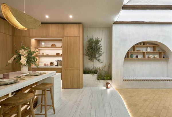 INKO Cocinas presenta una propuesta llamada DES-CONEXION. Se trata de un espacio diseñado con el Mediterráneo como telón de fondo, donde el espíritu de este se transmite a través de los materiales, los colores y la disposición del espacio.