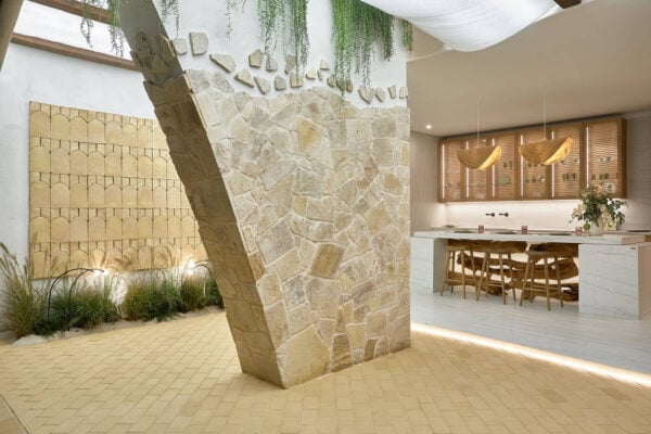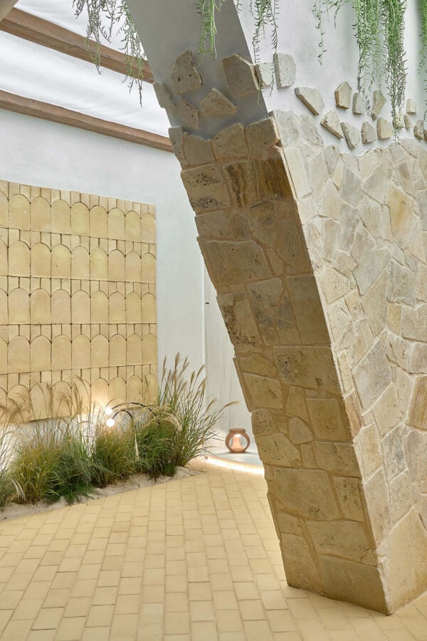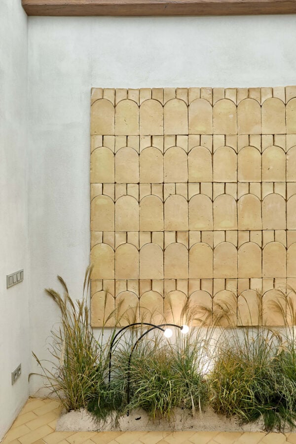Usando el modelo Vélez Bovedilla, una de nuestras colecciones de autor, hemos hecho un mural de barro que ocupa una de las paredes del patio prácticamente enteras, con la tonalidad Paja. Para el suelo, hecho con el Rectángulo 22×11, se ha escogido la tonalidad Bolonia, uno de nuestros nuevos acabados de barro de alta temperatura. Este color, inspirado en la arena y las dunas de las playas de Tarifa, encaja a la perfección con la gama del resto del espacio, que es de colores cálidos y acogedores, pero suaves, sin estridencias.