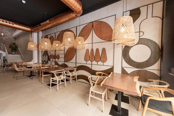 El restaurante destaca por una predominancia de colores neutros como el beige y el gris claro en contraste con el negro. El local está apoyado en un gran ventanal que permite aprovechar la luz exterior al máximo. Destacan mesas asimétricas, sillas y barra de madera, una decoración basada en las formas geométricas y detalles orgánicos como las fibras en color esparto de lamparas y apliques de techo que potencian el llamativo verde de las plantas de interior que decoran la estancia con un jardín vertical admirable.