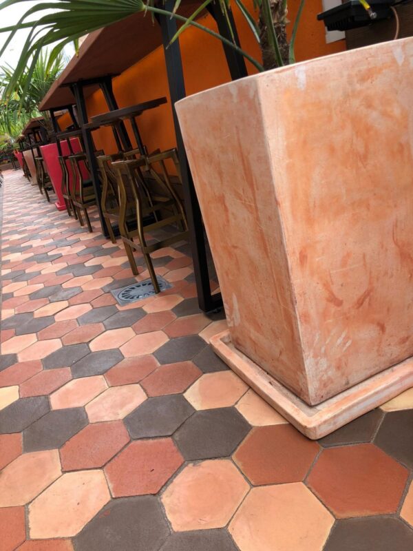 Los formatos seleccionados para la terraza fueron, por una parte, nuestro triángulo equilátero de 30 centímetros, una de nuestras baldosas más solicitadas. Por otra, los interioristas se decantaron por el hexágono 20, que da lugar a un teselado atemporal de mucho carácter. Ambos formatos, tan diferentes entre sí, conseguían delimitar los espacios pero compartían las mismas tonalidades: pizarra, paja flameada y rojiza. El resultado fue un suelo original y diferente en sintonía con el espíritu del restaurante que, además, es de origen natural y 100% sostenible.