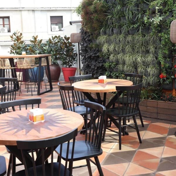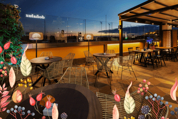 Las vistas que se aprecian desde el restaurante Doña Luz Rooftop solo pueden competir con los exquisitos platos fusión que crean en su cocina. El estudio Mostaza Design fue el encargado de darle identidad a este rooftop ubicado en pleno centro de Madrid y apostó por nuestras baldosas de barro para el proyecto.