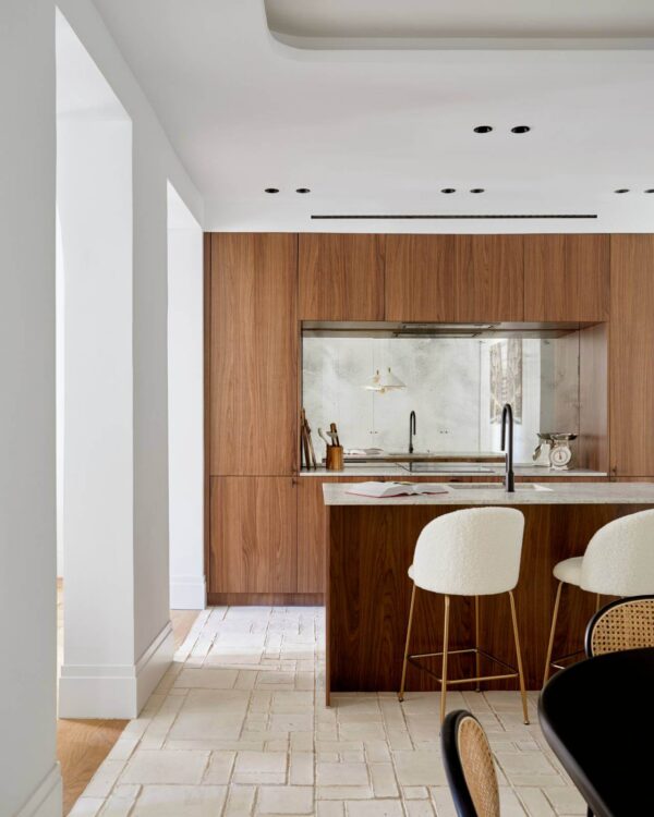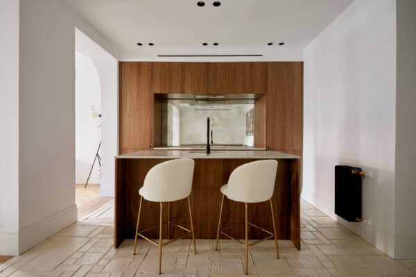 La arquitectura e interiorismo de T Residence corre a cargo de Raúl Martínez Padilla, quien ha apostado por la conexión interior-exterior del espacio. Y el resultado le ha salido redondo, pues este ha sido uno de los grandes aciertos del proyecto. Para ello ha tenido en cuenta la ubicación del apartamento, en uno de los barrios más señeros de nuestro país. Su identidad se refleja en los detalles que evocan elementos tradicionales, como la madera de roble con la que está panelada la cocina y el ratán presente en el mobiliario.