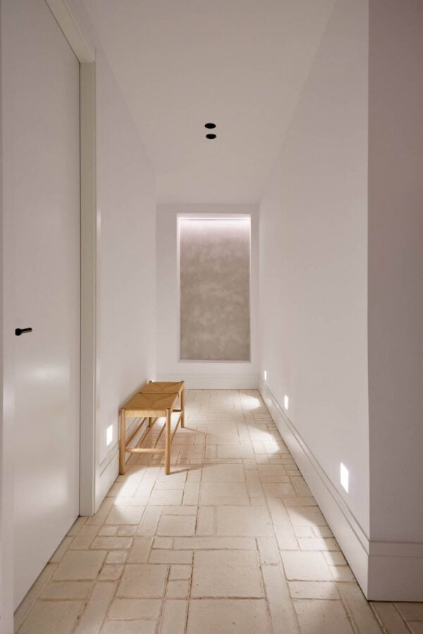Pero si hay un punto que hace de este un espacio singular y conectado con la tradición es el suelo. En este proyecto se utiliza el conjunto Mondrian de todobarro en acabado blanco antiguo, con el que se reviste el suelo de los pasillos y de la cocina-comedor de la vivienda.