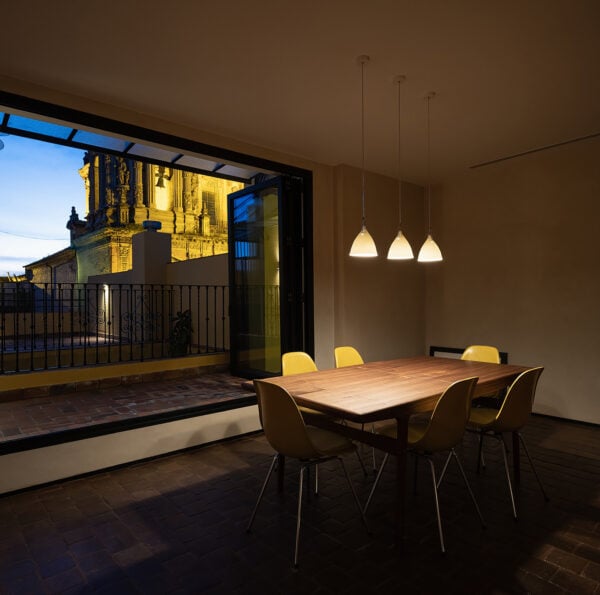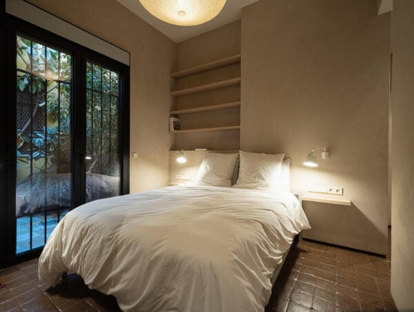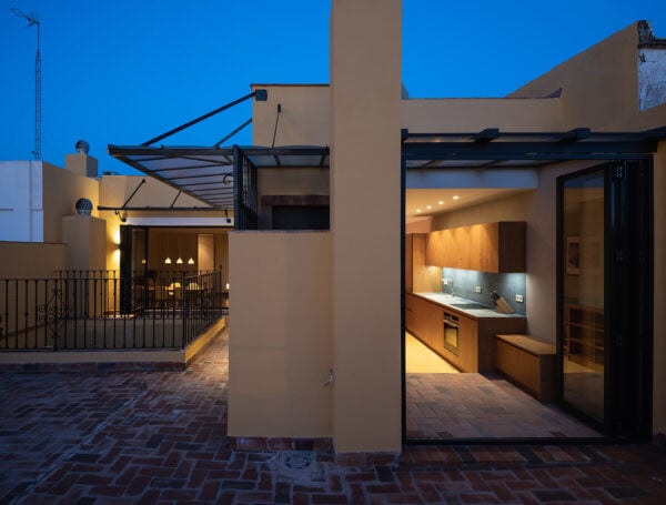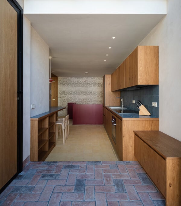Los suelos y paredes de mármol, barro cocido o piedra son muy habituales en los edificios que mejor soportan las condiciones extremas de la ciudad. Suelen ser materiales claros, lo que da a este proyecto una identidad única. La decisión de poner un suelo de barro oscuro en toda la planta de la vivienda contribuirá no solo a mantener unos niveles de humedad y temperatura idóneos, sino a dar una sensación muy especial al espacio (por no hablar de las posibilidades estéticas de un suelo oscuro, que son prácticamente infinitas).