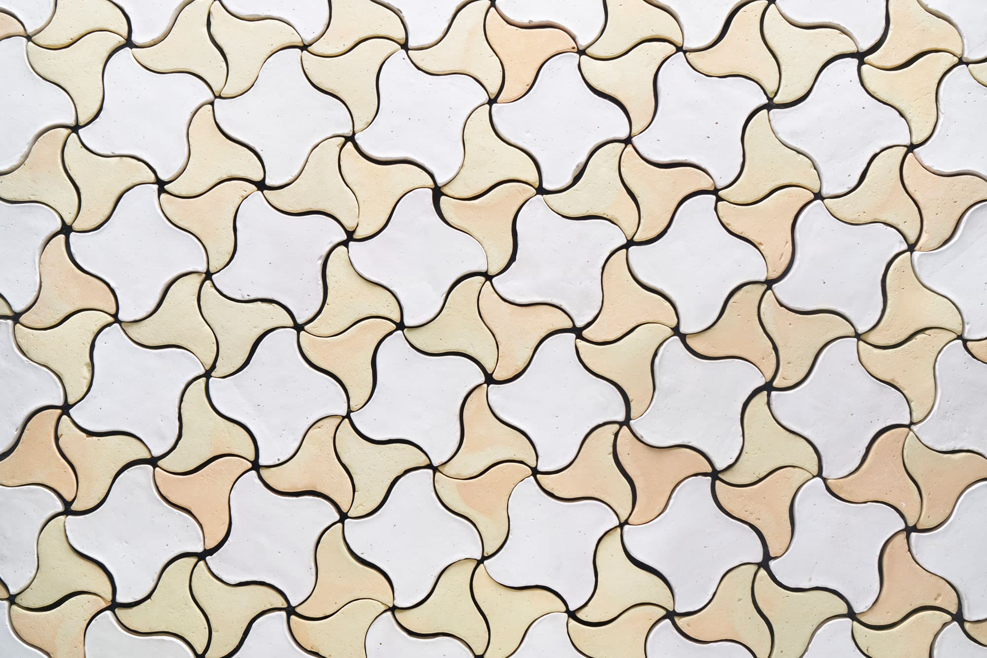 Esta hipnótica teselación surge de la combinación del formato Hélice 20 de cuatro puntas y el Hélice 20 de tres puntas. La tonalidad paja flameada, con matices anaranjados y rosáceos sobre una base clara en amarillo, resalta al contrastar con las baldosas en tonalidad blanca creando, en conjunto, un suelo de barro totalmente personal que transmite tranquilidad y calidez.